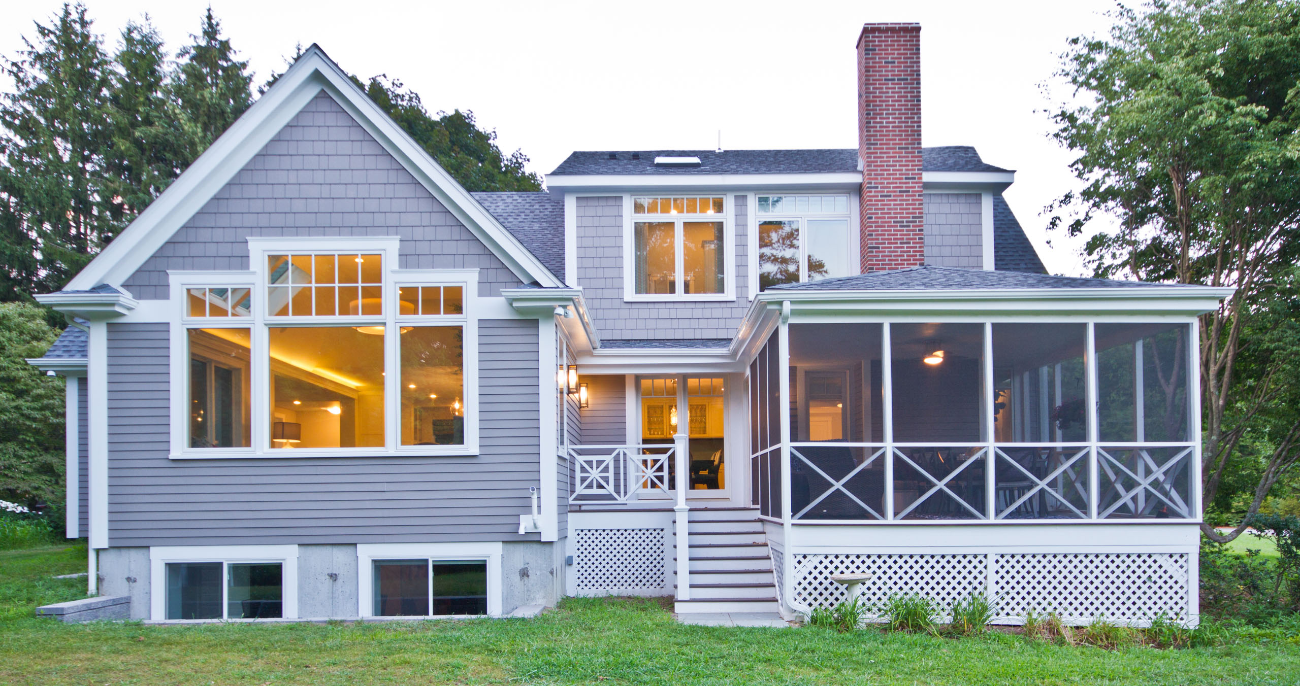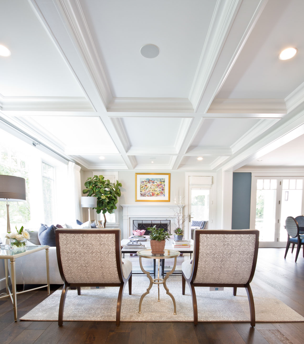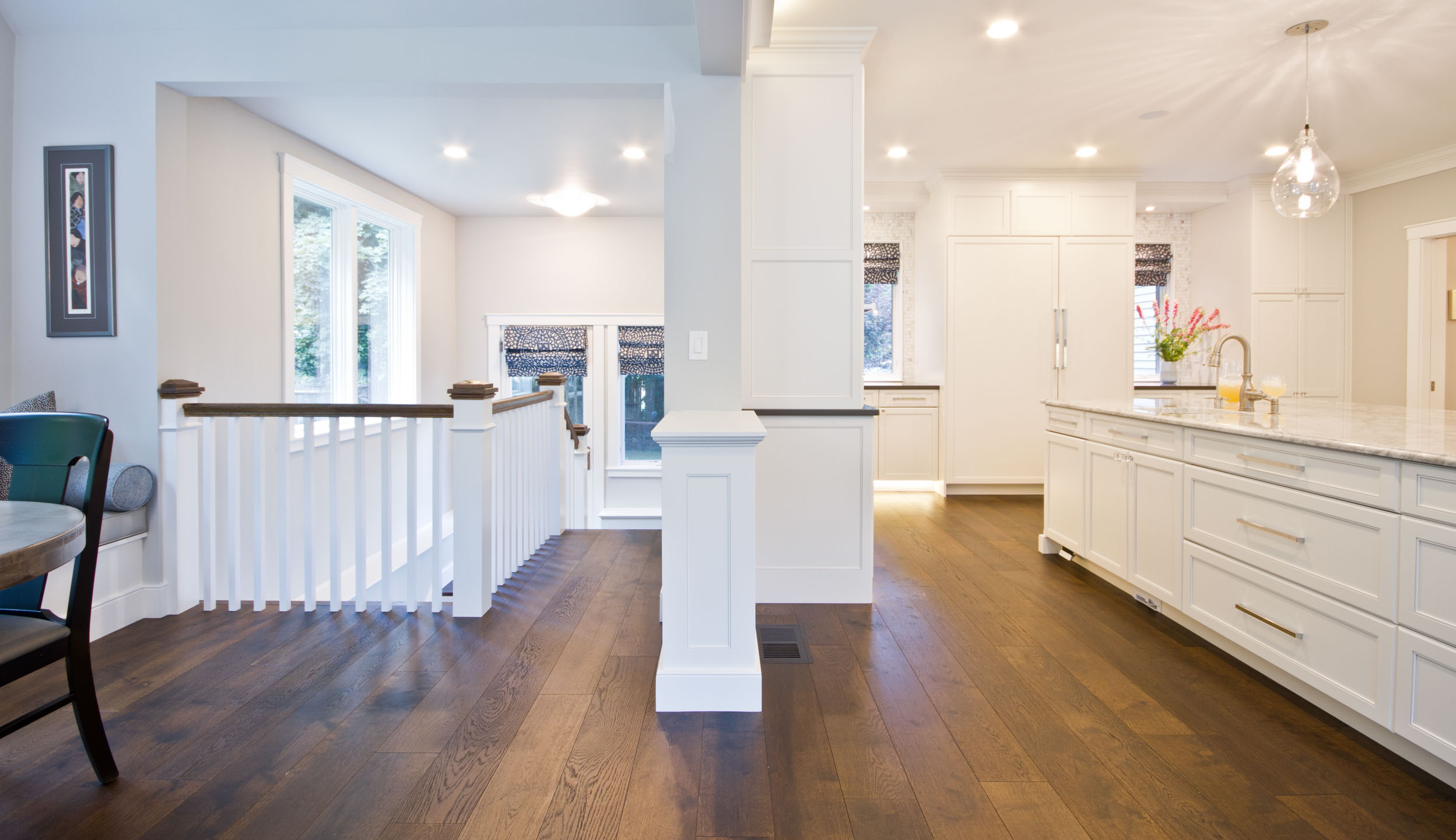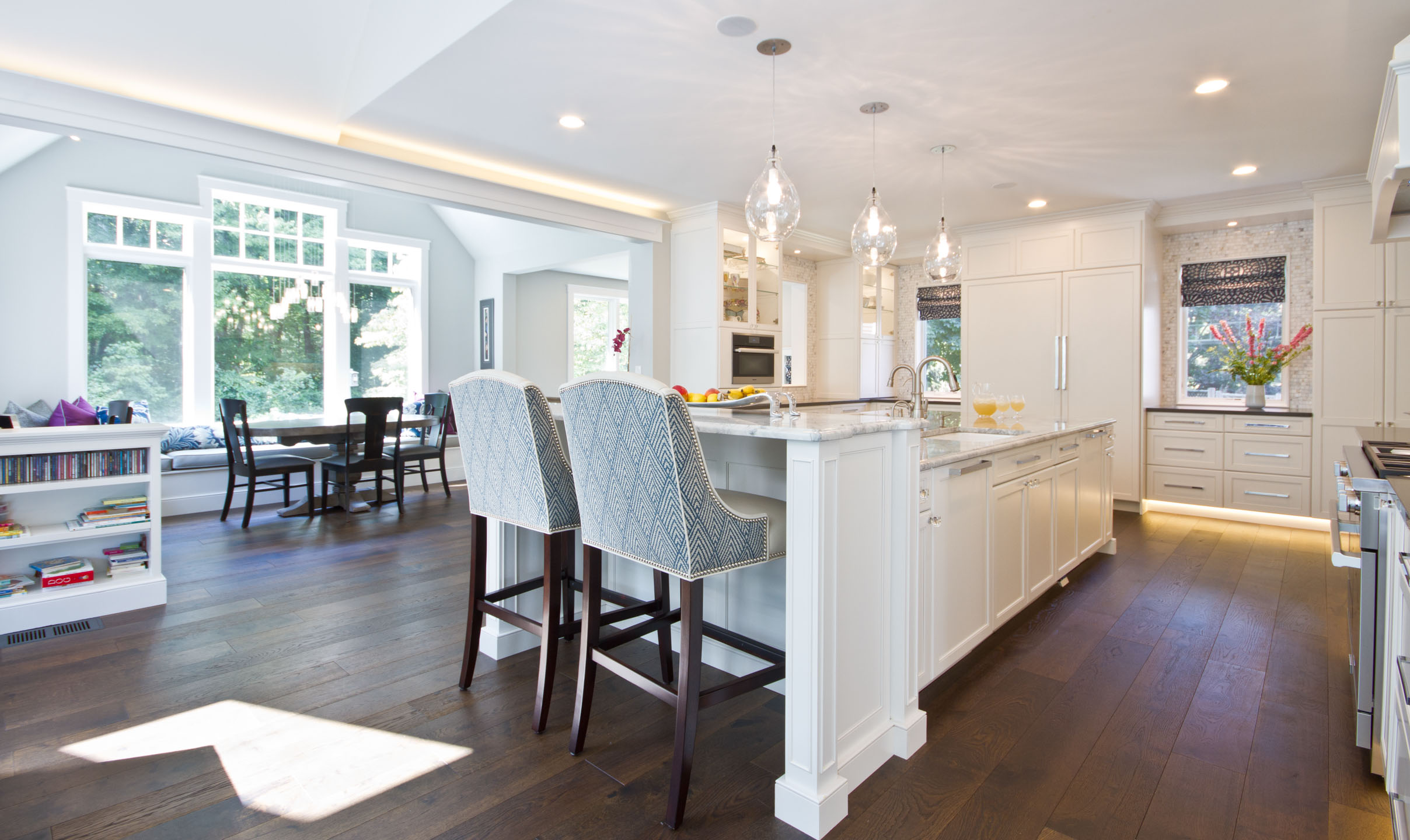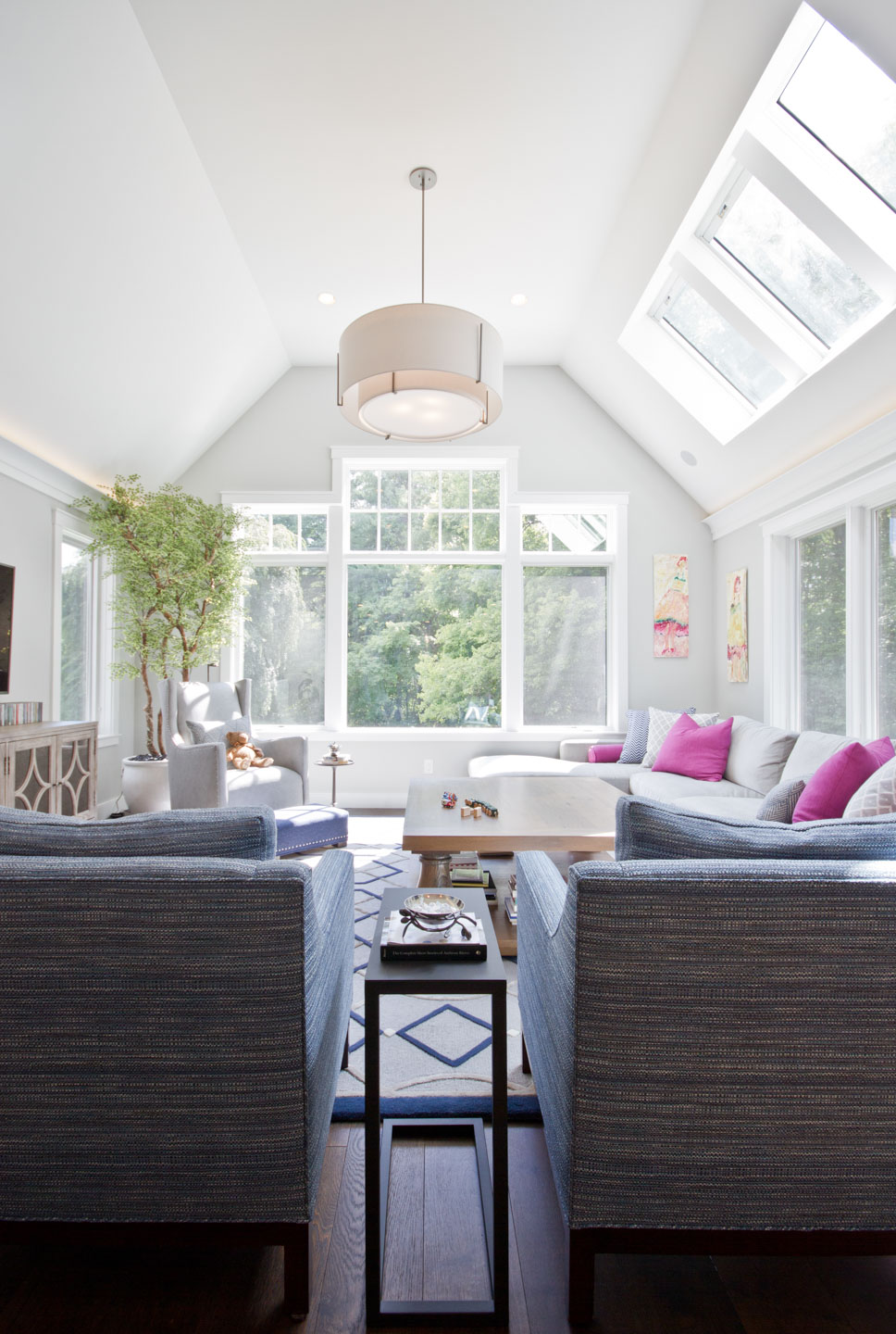 This light and fresh New England home was transformed with a complete gut and remodel, along with a large addition. We worked as a team with the architect, contractor and client to design the interiors as well as consult during the construction process. Upon completion we furnished the home, including art accessories and custom window treatments. Classic details, clean contemporary finishes, a cool palette and new functional spaces allow for gracious living for this young family. The property is on four acres of lush green open space, and features new large windows and skylights, a full finished basement, a large family friendly kitchen and a new second floor master suite bathed in sunlight.